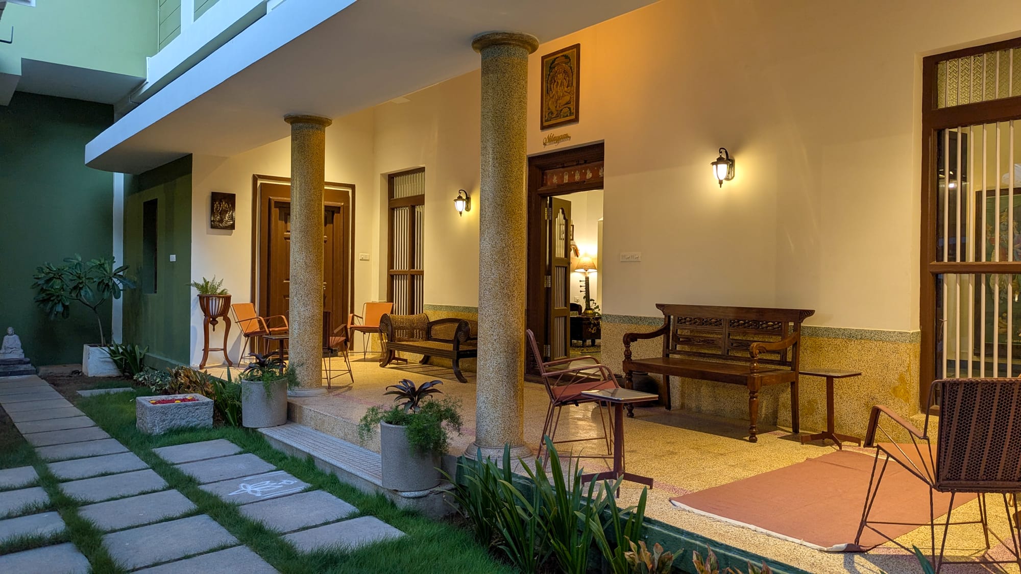 Nilayam is a spacious family home from the 1940s, located in the heart of Trichy. With six bedrooms, it is perfect for large families celebrating the New Year together. The home has been carefully restored with Art Deco details, old photographs, and family heirlooms that give it warmth and character.